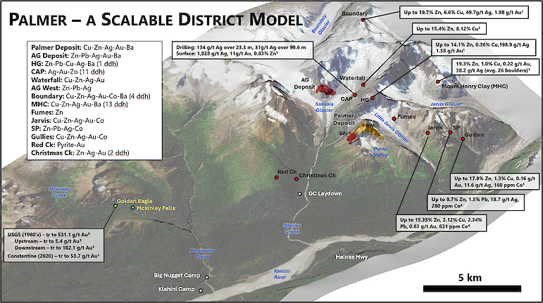 Figure 3. Southwest looking view of the Palmer Project showing the distribution of under-explored high-grade exploration targets. See references below for sources of data.