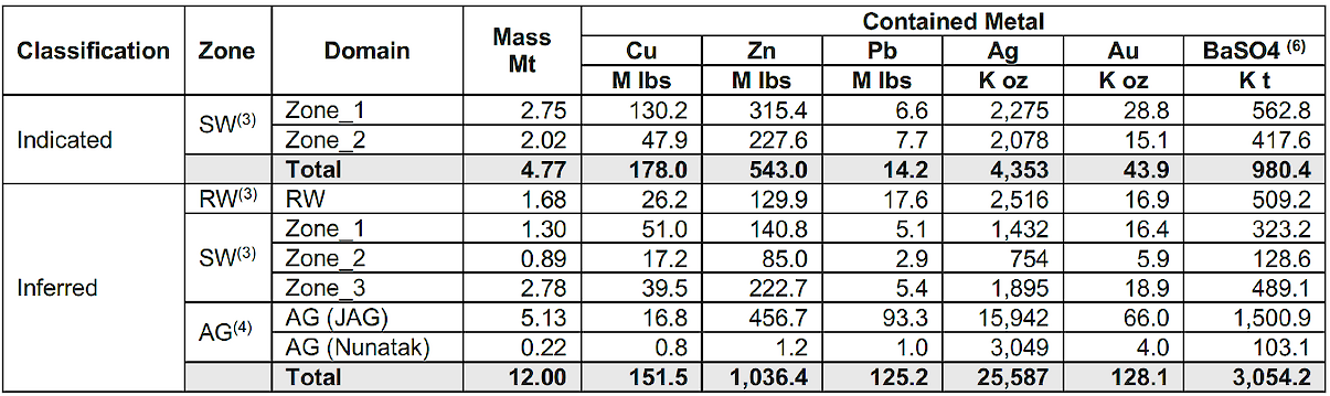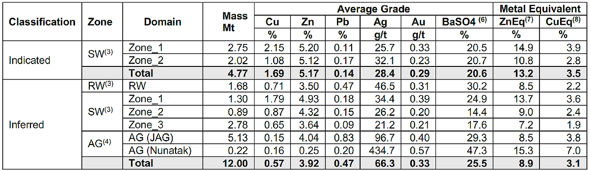 - Inferred: 12.00 million tonnes at 0.57% copper, 3.92% zinc (3.1% CuEq or 8.9% ZnEq)*. 151.5 million pounds of copper, 1,036.4 million pounds of zinc, with precious metals and barite (Table 1)