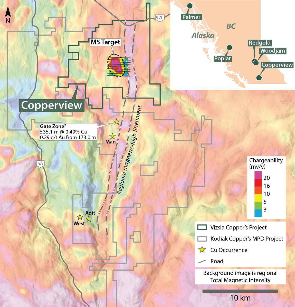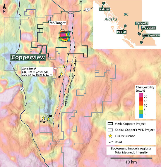 Drilling will focus on the recently defined M5 target, central to the Copperview Project (see June 11th, 2025, News Release, Figure 1). The till-concealed M5 target, largely defined on the basis of ground and airborne geophysical data, comprises a broadly northwest-southeast oriented >20 mv/v chargeability-high anomaly that spans 2.5 by 1.4 kilometers (Figure 1). The core of the chargeability-high anomaly is spatially associated with a strong conductivity-high (resistivity-low) anomaly observed in ground IP data as well as the recently compiled MobileMT1 survey (see November 2nd, 2023 News Release) and a marked break (magnetic-low anomaly) in north-trending regional-scale magnetic-high lineaments. The M5 target is along trend, 6.5 kilometers north of Kodiak Copper’s Gate discovery2 (Figure 1). Porphyry-related copper and gold mineralization at the Gate discovery is spatially associated with a strong chargeability-high coincident with a similar break in the regional-scale magnetic-high lineament (Figure 1).